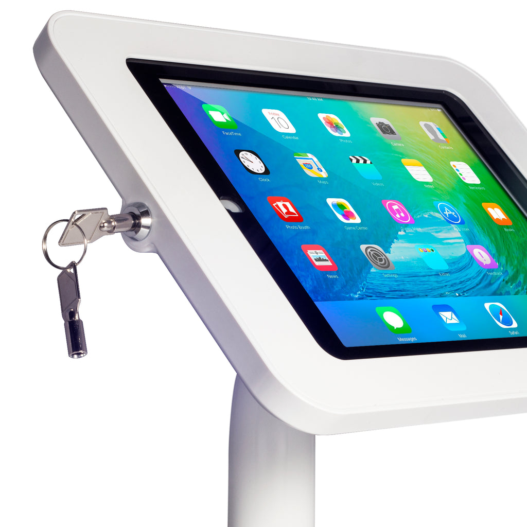 Each Elevate II tablet kiosk enclosure is equipped with a lock and key so you can keep your tablet in the enclosure without fear of it being removed. Each tablet kiosk comes with a locking slot compatible with Kensington Locks, so you can tether the entire kiosk to an immovable object for maximum security.
